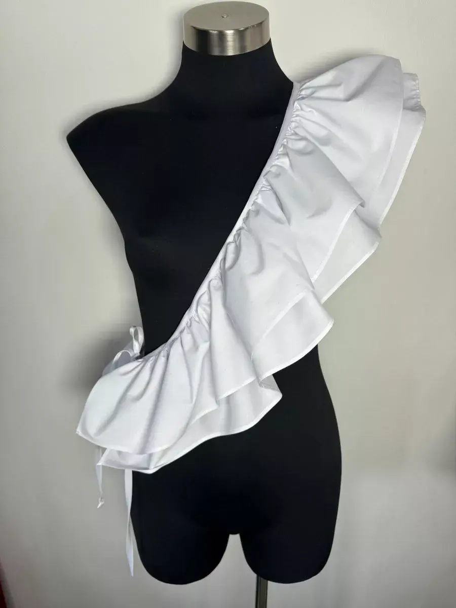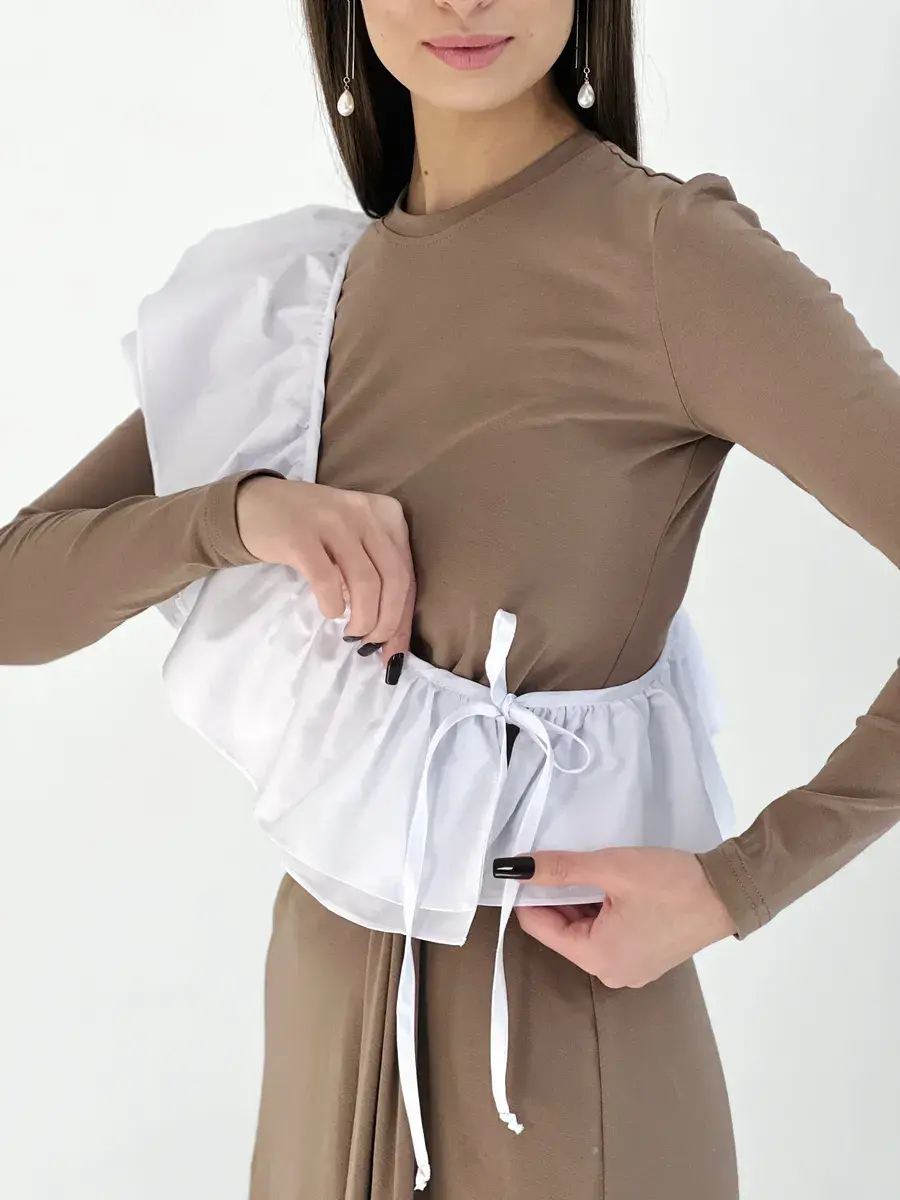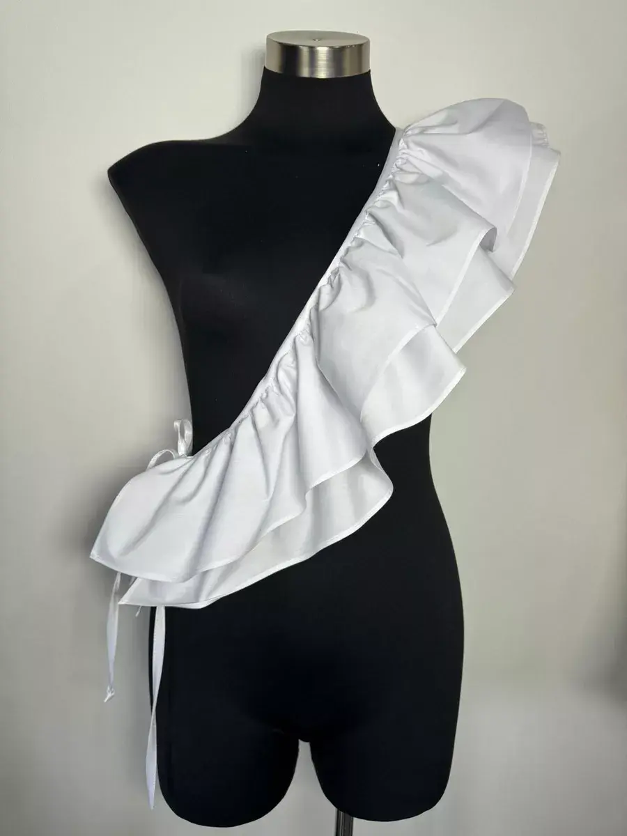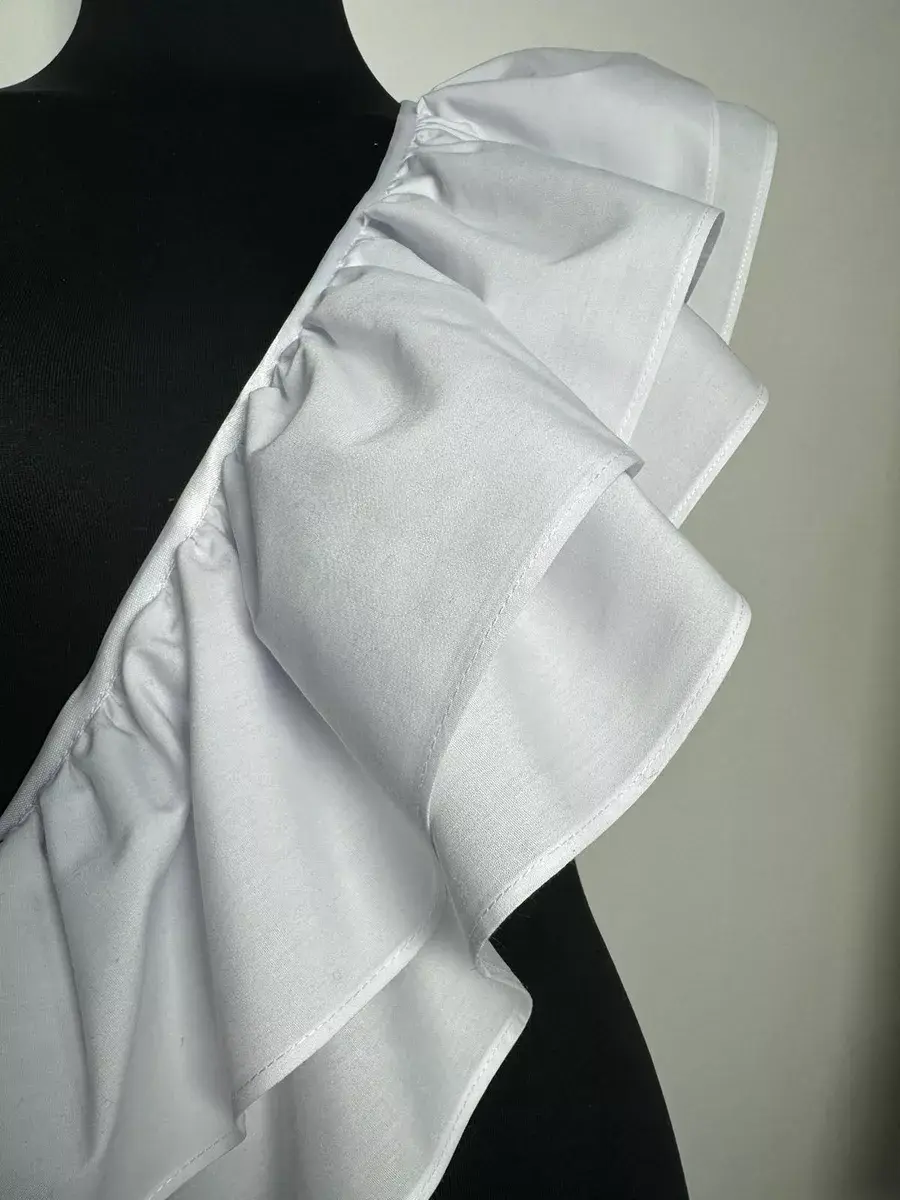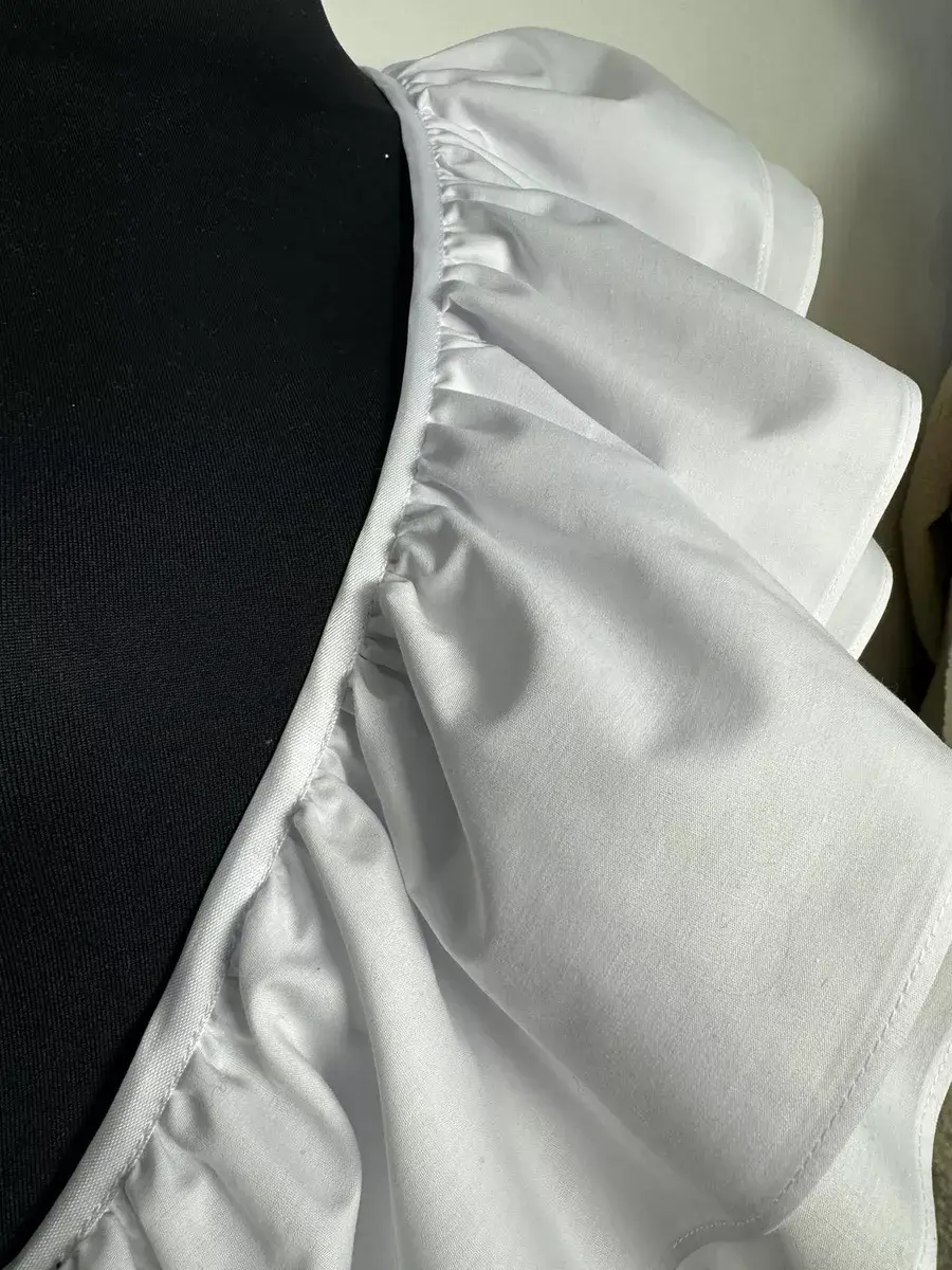 Накладной воротник — это оригинальный и эффектный аксессуар любой модницы. Идеальная акцентная деталь на любой праздник и торжество - день рождение, корпоратив, выпускной. Объемный воротничок с воланами является трендовой деталью для праздничного наряда или повседневного на работу в офис и в школу. Варианты ношения: на одно плечо или на шею, на грудь или на талию. Длина без завязок 1 метр, ширина – 16 см. Съемная баска с завязками – это универсальное украшение для женщин и девушек подростков. Жабо манишка дополнит вечерний женственный наряд и придаст образу романтичность и нежность, можно надеть в театр, на праздник или как деталь для вечеринки, фотосессии или на свидание. Особенно стильно будет сочетаться с брутальными вещами: свитшот, футболка, тренч, косуха. Также можно создавать более женственный образ, при сочетании с лаконичными платьями, блузами, свитерами. Рюша – акцентная деталь, поэтому сочетать ее лучше с предметами гардероба с минималистичным кроем. В этом случае базовые изделия гардероба замечательно подойдут: пиджаки и джемперы, брюки, джинсы, юбки. Это отличный подарок для любимой подруги и девушке, маме и жене, сестре. Хорошо держит форму и объем, важно после упаковки разутюжить складки или отпарить на низких температурах, так рюши раскроются, как бутон цветка. Баска на одно плечо подойдет для стильного офисного делового стиля. Базовые вещи - будут выглядеть по-другому с этим аксессуаром. Садится на любую фигуру от 40-56 размера. Произведено в России. Ручная работа. Информация по уходу: Ручная стирка при температуре не более 30 %