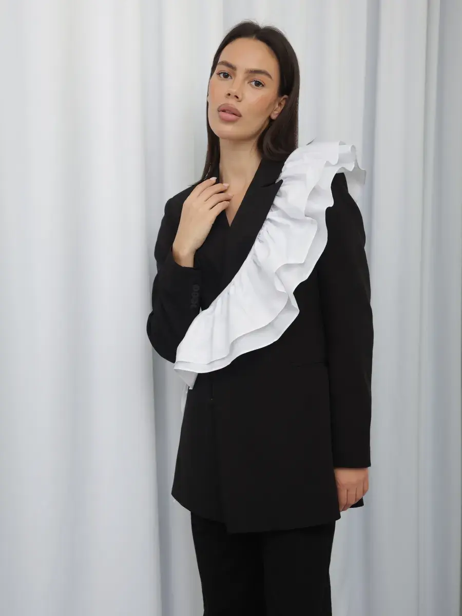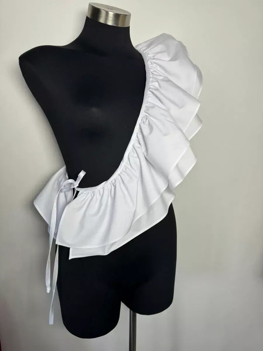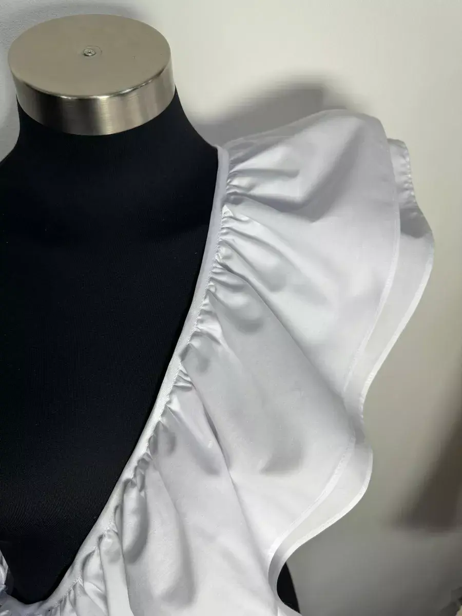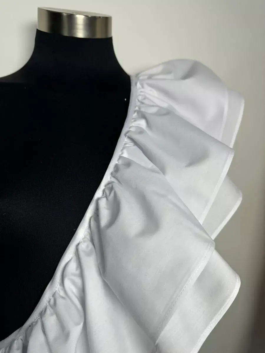 Накладной воротник — это оригинальный и эффектный аксессуар любой модницы. Идеальная акцентная деталь на любой праздник и торжество - день рождение, корпоратив, выпускной. Объемный воротничок с воланами является трендовой деталью для праздничного наряда или повседневного на работу в офис и в школу. Варианты ношения: на одно плечо или на шею, на грудь или на талию. Длина без завязок 1 метр, ширина – 16 см. Съемная баска с завязками – это универсальное украшение для женщин и девушек подростков. Жабо манишка дополнит вечерний женственный наряд и придаст образу романтичность и нежность, можно надеть в театр, на праздник или как деталь для вечеринки, фотосессии или на свидание. Особенно стильно будет сочетаться с брутальными вещами: свитшот, футболка, тренч, косуха. Также можно создавать более женственный образ, при сочетании с лаконичными платьями, блузами, свитерами. Рюша – акцентная деталь, поэтому сочетать ее лучше с предметами гардероба с минималистичным кроем. В этом случае базовые изделия гардероба замечательно подойдут: пиджаки и джемперы, брюки, джинсы, юбки. Это отличный подарок для любимой подруги и девушке, маме и жене, сестре. Хорошо держит форму и объем, важно после упаковки разутюжить складки или отпарить на низких температурах, так рюши раскроются, как бутон цветка. Баска на одно плечо подойдет для стильного офисного делового стиля. Базовые вещи - будут выглядеть по-другому с этим аксессуаром. Садится на любую фигуру от 40-56 размера. Произведено в России. Ручная работа. Информация по уходу: Ручная стирка при температуре не более 30 %