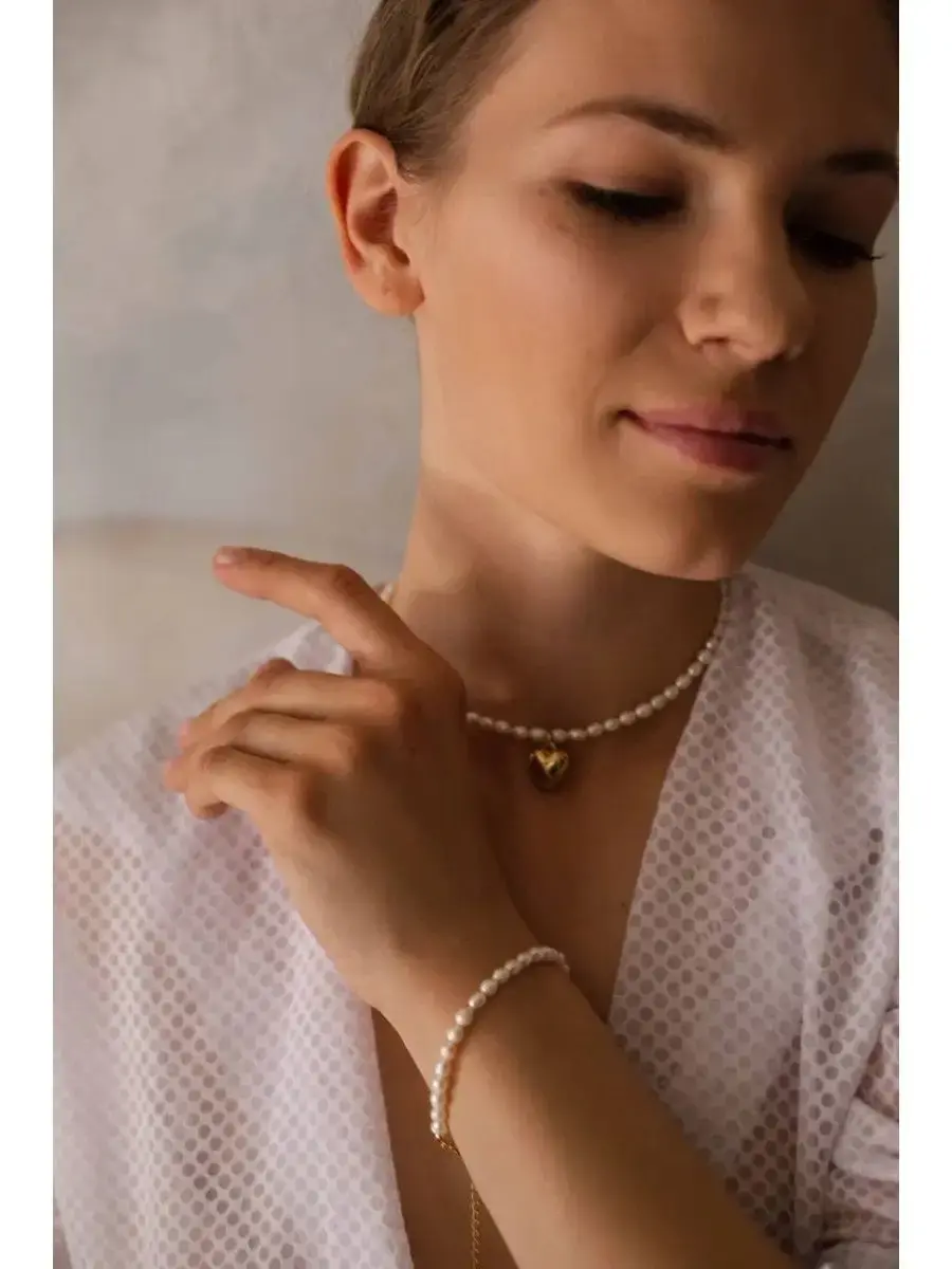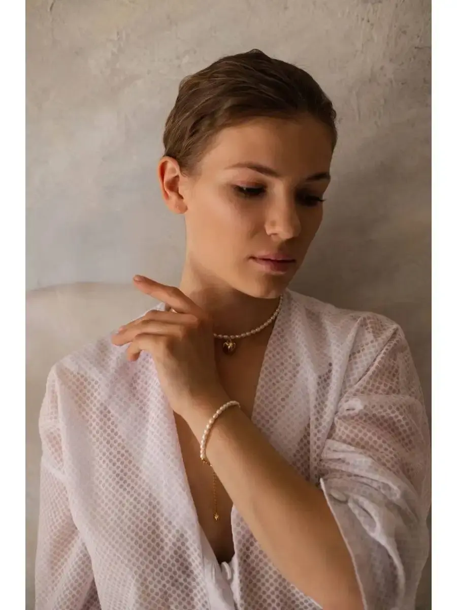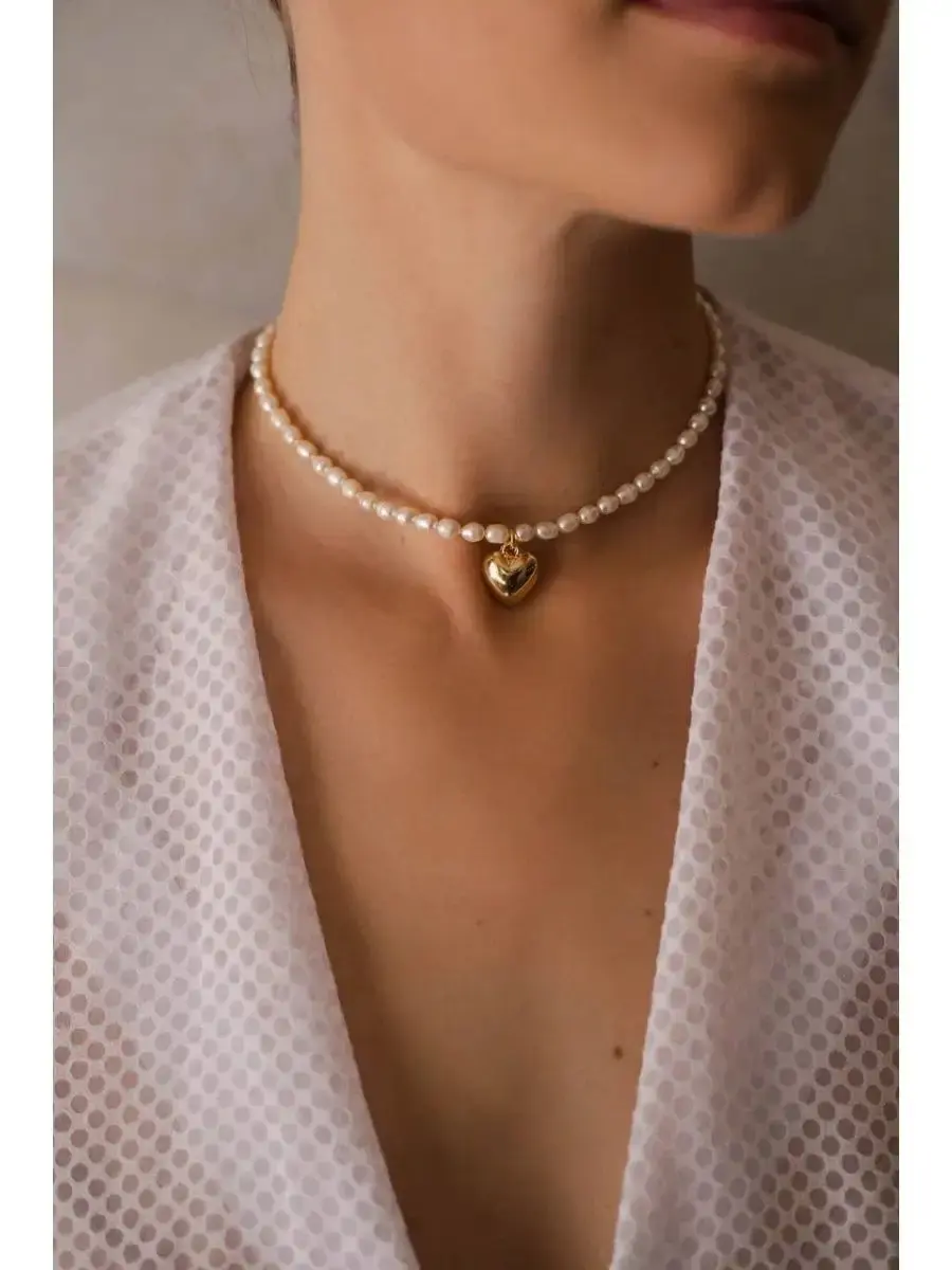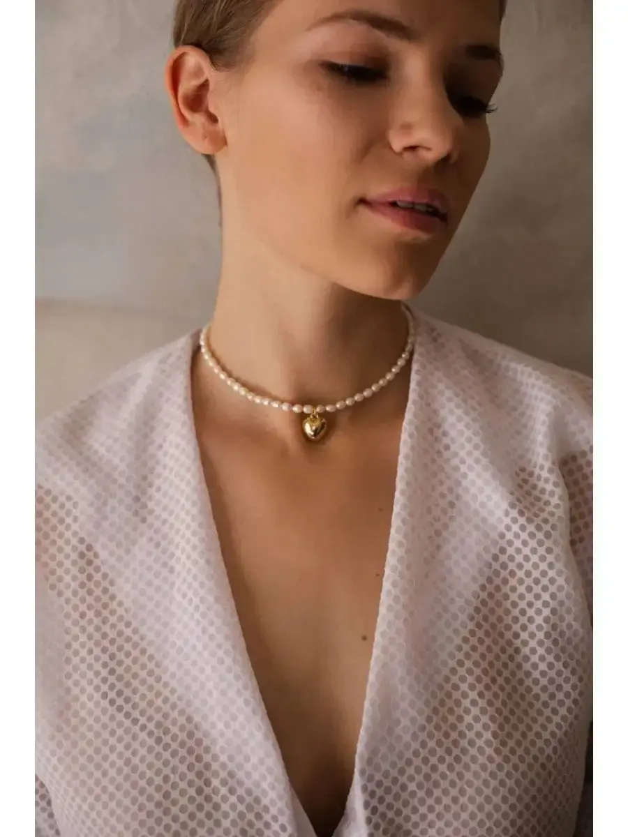 Нежное колье из натурального речного жемчуга высокого качества. Максимальная длина 39 см, минимальная 35 см. Идеальный вариант на Новогодний корпоратив и празднование Нового года. Фурнитура металлическая и выполнена из гипоаллергенного сплава и имеет стойкое покрытие позолотой - 24K, прослужит вам долгое время и не облезет при первой же носке! Поэтому украшение на шею не темнеет, не окисляется со временем и подходит для чувствительной кожи. Цвет цепочки золото. Сердце - металлическое. Так же если обвить ожерелье вокруг руки в два оборота, получится красивый браслет из жемчуга! Наш модный и стильный аксессуар на шею дополнит любой образ, его можно сочетать с деловым или повседневным стилем - на работу в офис, на прогулку, в гости, а так же дополнит вечерний праздничный образ, отлично для фотосессии, корпоратив. Бусы с жемчугом можно преподнести в качестве подарка любимой девушке и жене, бабушке, подруге и сестре, маме и дочке подростку. Подарок в виде модного жемчужного ожерелья уместен на день рождение и помолвку, любой праздник. Изысканный чокер придаст вечернему образу элегантности. Белая жемчужная нить на шее у невесты будет великолепным акцентом и достойным завершением нарядного образа на свадьбе. Наша женская бижутерия на шею всегда будет носиться с удовольствием. В комплекте идёт красивая подарочная коробочка, в котором подарок будет еще приятнее.