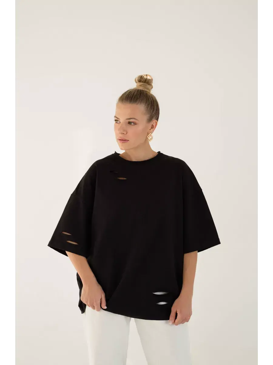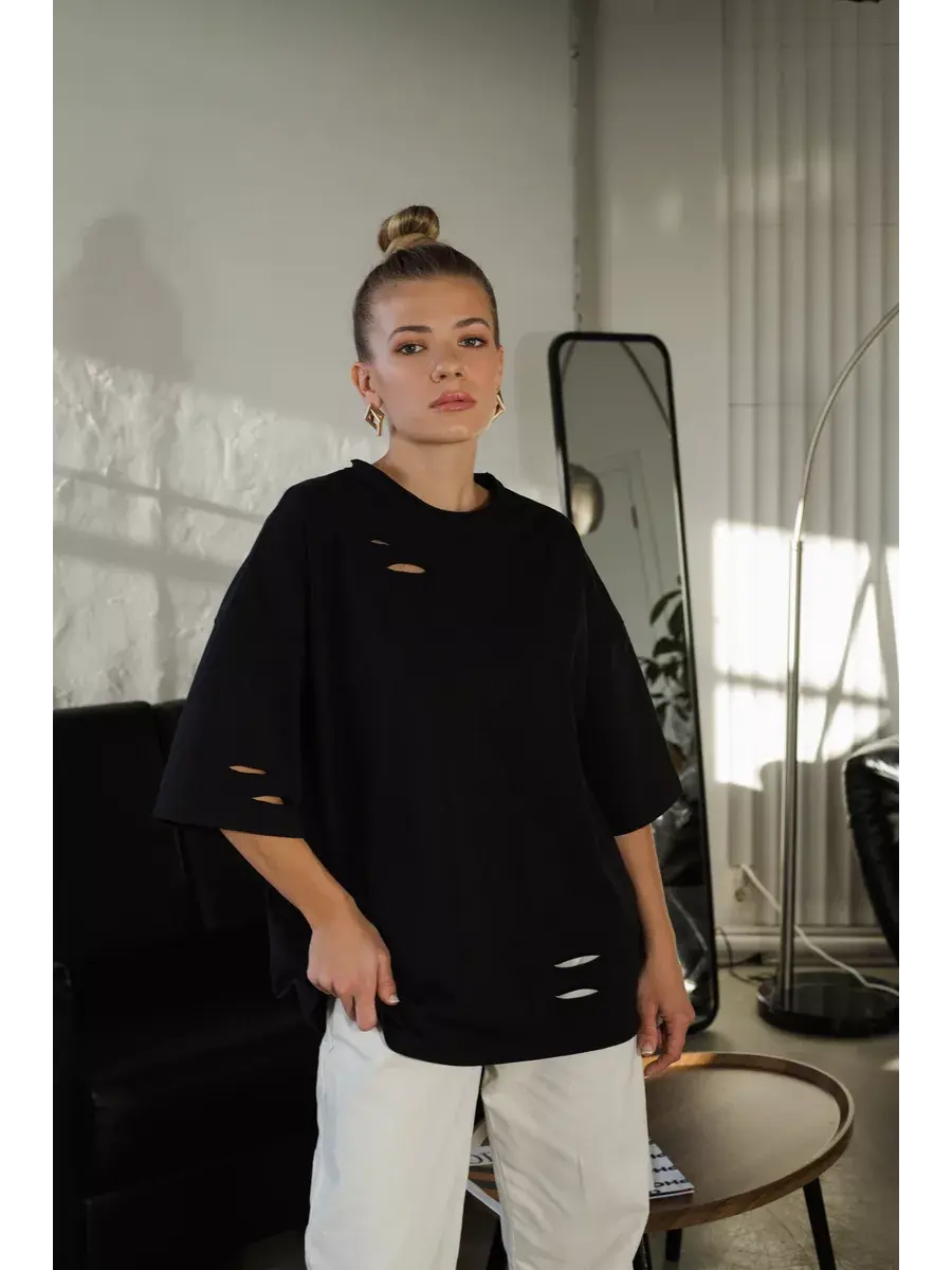 Стильная базовая футболка оверсайз поможет вам создать модный образ на каждый день. Плотность ткани - 280 гр/м. Акцентная деталь - дырки в ткани, которые выделяют ее на фоне других однотипных моделей. Трикотажный топ с рукавами на 95% выполнен из высококачественного плотного дышащего хлопка, что позволяет вещи не вытягиваться и не деформироваться после стирки и красиво сидеть на любой фигуре. Используем ткань только высшего качества Турецкого производства. Невероятно комфортная, приятная к телу базовая футболка правильной длины – слегка удлиненная, которая хорошо смотрится навыпуск и в заправленном виде и более универсальная по сравнению с короткими или укороченными моделями. Свободный покрой оверсайз не сковывает движения, что важно для повседневной носки. Это базовая вещь, которая легко сочетается с любой одеждой и подойдет для создания как повседневного, так и нарядного образа. А если добавить к нему яркие аксессуары, то ваш вечерний образ на вечеринку и дискотеку в клуб точно не останется незамеченным. Это универсальная и практичная вещь, которую вы можете носить весной, летом и осенью. Летняя молодежная футболка прямого кроя сочетается с любым стилем и станет вашим любимчиком при выборе образа в офис и на работу. Легкая футболка y2k подходит для занятий спортом: фитнеса и йоги, бега и гимнастики, тренировок в зале и танцев и физкультуре в спортзале в школе. Подойдет женщинам и девушкам любого роста: высоким и невысоким. Ее могут носить взрослые и подростки. Вы можете приобрести ее для себя или в качестве подарка на день рождения маме, сестре, жене, подруге и дочке. Отлично подойдет любителям аниме, панк одежды, ретро винтажного стиля, гранж дрейн рок винтаж. Идеальна для отдыха дома и на даче, в поездку на море для прогулок по пляжу.